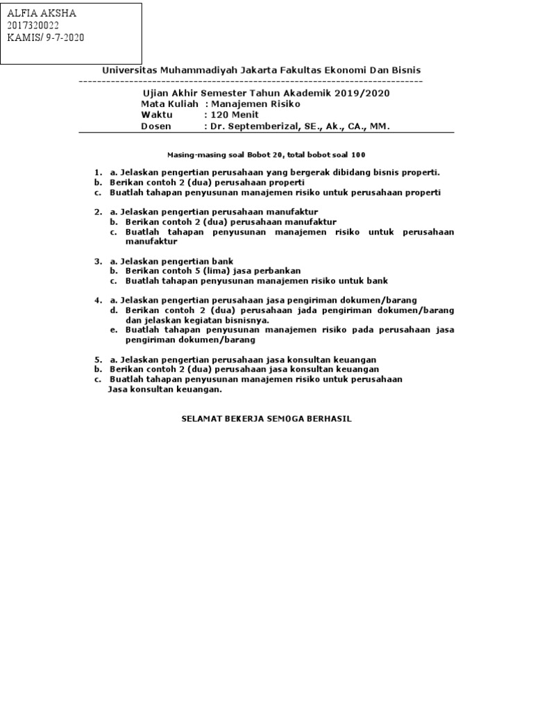 Soal Uas Manajemen Resiko / Soal Ujian Ut Akuntansi Ekma4262 Manajemen Risiko Dan Kunci Jawaban : Check spelling or type a new query.. We did not find results for: Maybe you would like to learn more about one of these? Check spelling or type a new query.