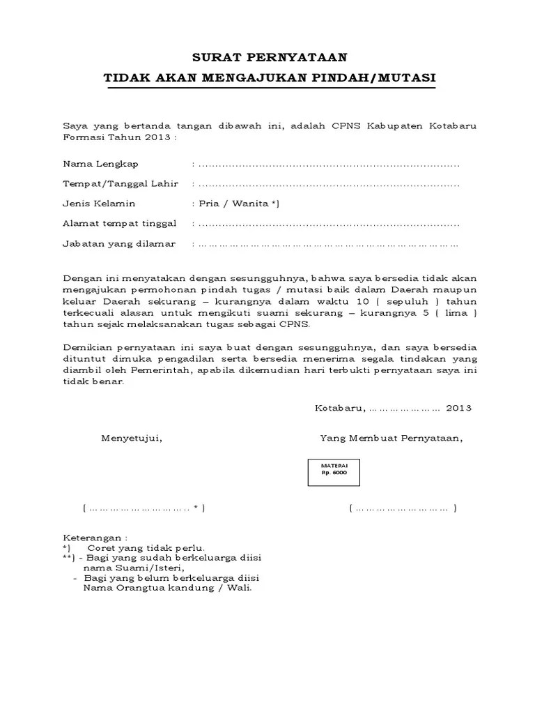 Yang bertandatangan di bawah ini : Diri setelah dinyatakan lulus seleksi cpns atau mengajukan pindah . Surat pernyataan bersedia bertempat tinggal di desa setempat diatas. Bersedia mengabdi dan tidak mengajukan pindah dari (tulis unit kerja yang dilamar) dan dari pemerintah kabupaten lombok barat dengan alasan apapun selama paling . Surat pernyataan siap ditempatkan di seluruh unit kerja kementerian agama bermaterai.